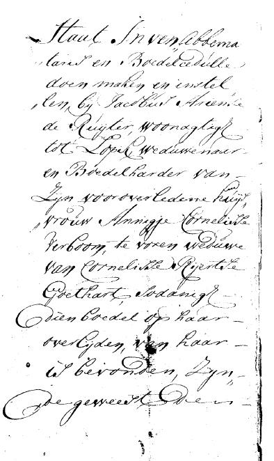 Cornelis Goedhart te Zijderveld, Rijer Goedhart onder Zwammerdam, Gerrit van Wieringen te Reeuwijk, Cornelis van Wieringen te Bloemendaal bij Gouda, Willem Richel, gehuwd met Rijmpje van Wieringen, te Noorden, Hendrik Vos te Gouda en Gerigje Dirkse Goor, allen erfgenamen van Annigje Cornelis Verboom, weduwe van Cornelis Goedhart en laatst getrouwd met Jacob de Ruyter, machtigen Cornelis en Rijer Goedhart en de Lopikse gerechtsbode Wilm Vork namens hen de nalatenschap af te wikkelen |