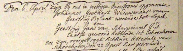 Johannes Reijerse Goedhart, treed op 26 december 1723 in het huwelijk. Bron: trouwboek 8, pagina 3V uit Schoonhoven, volgens een districtklapper (pagina 41 – District Krimpenerwaard) op de (onder)trouwregisters in de provincie Zuid-Holland, inventaris 257, gahetna.nl: http://proxy.handle.net/10648/ebbe13dd-551b-4876-abe5-6f68cf4aaeef |