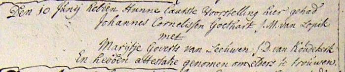 Marijtje huwt 15-9-1743, als weduwe van Johannes Goethart, te Kouderkerk met: Christoffel Kijpke, geboren in Potzdam (bron: trouwboek Kouderkerk). |