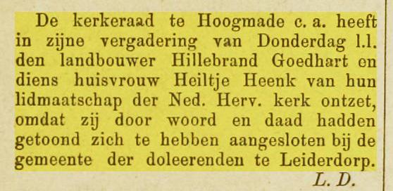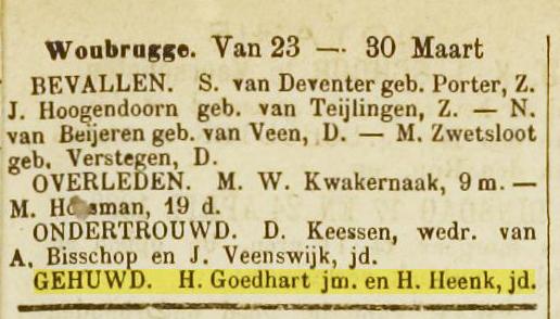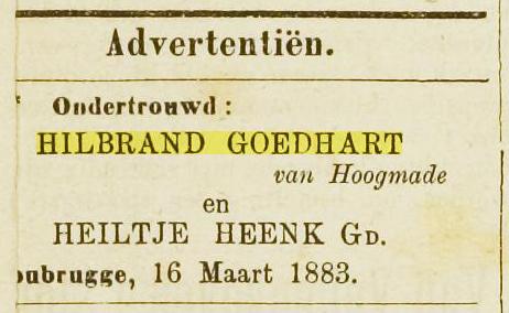 Huwelijk afkondigingen 18-03-1883 en 25-03-1883 te Woubrugge, getuigen zijn onder andere oom Gerrit Goedhart (getrouwd met Clazina Bos) en broer Simon Goedhart. |