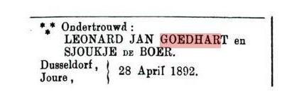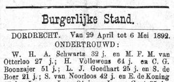Ondertrouw gepubliceerd in Christelijk Nieuwsblad, 7 mei 1892, in rubriek Burgerlijke Stand van gemeente Dordrecht, van 29 april tot 6 mei. |