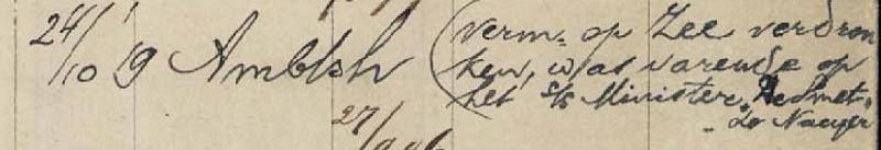 Vermist op zee, verdronken, was varende op het stoomschip Minister De Smet de Naeyer.