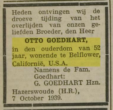 Het echtpaar Otto Goedhart en Petronella Mostert emigreerde in 1912 naar de USA, sponsor was Pete Rietkerk. Ze werkten drie jaar op de melkveehouderij van Mr. Rietkerk. In 1915 was er genoeg geld gespaard om een eigen melkveehouderij te beginnen in Waukena California.